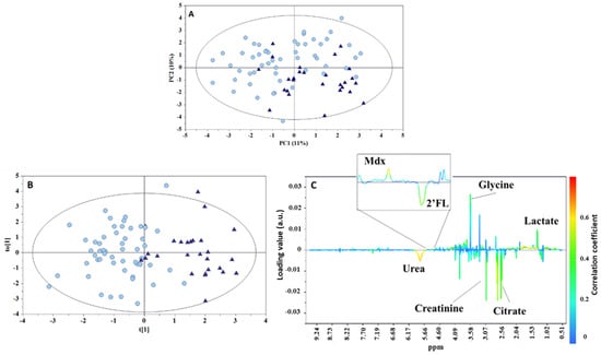 (A) PCA scores plot (PC1 vs. PC2) from 1H NMR infant urine spectra, (B) OPLS-DA scores, and (C) loadings plots for the two types of feeding groups: breastmilk (circle) and mixed feeding (triangle). R2Y = 0.639, Q2 = 0.216, p < 0.001. Mdx—maltodextrin; 2′FL—2′fucosyllactose.
