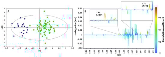 OPLS-DA scores (A) and correlation coefficient S-line (B) plots for the two groups of urine taken from infants born from a secretor (green) or a non-secretor (blue) mother. R2Y = 0.804, Q2 = 0.374, p < 0.001.