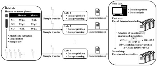 Mass spectrometry (MS)-based metabolomics have been widely applied to a variety of research fields, targeting microorganisms, plants, animals, and humans, to understand metabolism in the body [1,2,3,4]. Additionally, the relatively large datasets obtained from metabolomics are treated in large-scale studies, such as cohort and epidemiological studies [5,6,7]. When small-scale studies based on MS-based metabolomics are carried out, it is sufficient to proceed with metabolomics in one laboratory; in these cases, there is no particular problem with using only one mass spectrometer or protocols optimized at one laboratory. However, large-scale studies often require metabolomic analyses using various types of mass spectrometers in multiple laboratories. In these situations, data integration between laboratories is an issue to be considered. It has been reported that the use of different metabolomics platforms in biomarker studies based on non-targeted metabolomics results in low confidence in the reproducibility of the results [8].