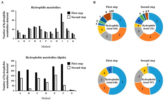 Number of metabolites detected by each analytical method and the percentages of the metabolites measured in common by multiple methods: (A) the numbers of metabolites detected by each analytical method for the hydrophilic or hydrophobic metabolites are shown; (B) the percentages of metabolites commonly measured by multiple methods are shown using pie charts. In the first step, 160 hydrophilic metabolites and 640 hydrophobic metabolites were identified in both human and mouse plasma. In the second step, 113 hydrophilic metabolites and 297 hydrophobic metabolites were identified in both human and mouse plasma.