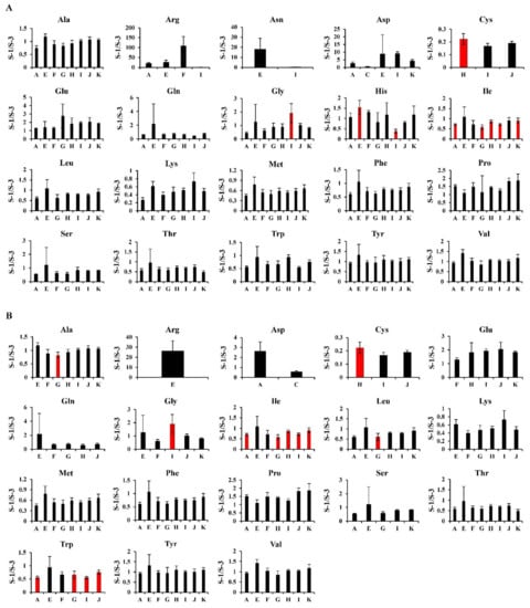 Inter-laboratory comparisons of the relative quantification for essential and non-essential amino acids. The relative quantification values (S-1/S-3) from the first (A) and second (B) steps for essential and non-essential amino acids are presented as the mean ± SD obtained from triplicate experiments. The red bars in each graph show the metabolites that were judged as the outliers based on one-way ANOVA (α = 0.05).