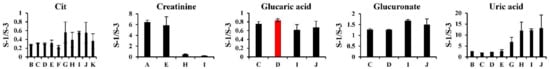 Examples of hydrophilic metabolites with remarkable differences between LC/MS, CE/MS, IC/MS, and GC/MS. As the examples of hydrophilic metabolites with remarkable differences among multiple methods (LC/MS, CE-MS, IC/MS, and GC/MS), the results of relative quantification (S-1/S-3) from the first step data treatment for citric acid (Cit), creatinine, glucaric acid, glucuronate, and uric acid are shown. The values are presented as the mean ± SD obtained from triplicate experiments. Red bars indicate outliers based on one-way ANOVA (α = 0.05).