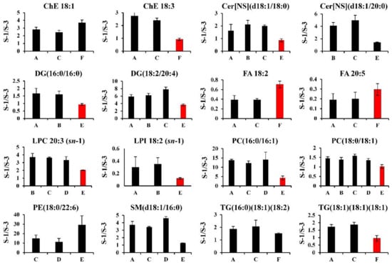 Examples of hydrophobic metabolites with remarkable differences between LC/MS and SFC/MS. As examples of hydrophobic metabolites with the remarkable differences between LC/MS and SFC/MS, the results of the relative quantification (S-1/S-3) from the first step data treatment for ChE 18:1, ChE 18:3, Cer[NS](d18:1/18:0), Cer[NS](d18:1/20:0), DG(16:0/16:0), DG(18:2/20:4), FA 18:2, FA 20:5, LP C 20:3(sn-1), LPI 18:2(sn-1), PC(16:0/16:1), PC(18:0/18:1), PE(18:0/22:6), SM(d18:1/16:0), TG(16:0) (18:1) (18:2), and TG(18:1) (18:1) (18:1) are shown. The values are presented as the mean ± SD obtained from triplicate experiments. Red bars indicate outliers based on one-way ANOVA (α = 0.05).