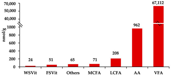 The reverse-phase LC–MS/MS assay identified 94 fecal metabolites including volatile fatty acids, amino acids, fat- and water-soluble vitamins, and medium- and long-chain fatty acids (Supplementary Material Table S1). Figure 1 shows fecal metabolites grouped by affinity. Volatile fatty acids (VFA) exhibited the highest molar proportions of the metabolites detected in fecal samples (67,112 nmol/g; 97.98%), followed by amino acids (AA; 962 nmol/g; 1.40%), long-chain fatty acids (LCFA; 208 nmol/g; 0.30%), medium-chain fatty acids (MCFA; 71 nmol/g; 0.10%), fat-soluble vitamins (FSVit; 51 nmol/g; 0.07%), and water-soluble vitamins (WSVit; 24 nmol/g; 0.04%).