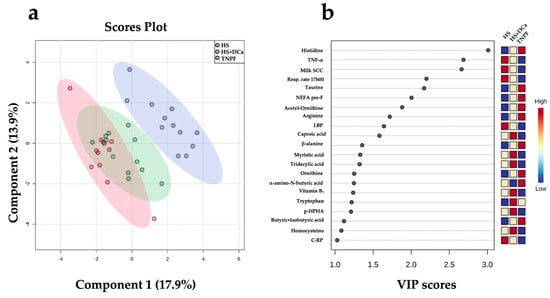 Partial least squares discriminant analysis (PLS-DA) revealed a distinct separation between the HS and TNPF groups (p = 0.001; Figure 3a). Cross-validation across two components with 999 random permutation tests yielded significant p-values that were found for Q2 = 0.522, p = 0.001, and R2Y = 0.816, p = 0.001, respectively. The variable importance projection (VIP) scores analysis on component 1 identified 21 variables with a VIP score > 1 (Figure 3b). Among these markers, respiratory rate at 17h00, TNF-α, LBP, milk SCC, and C-reactive protein (C-RP) were the highest in the HS group, whereas taurine, NEFA, acetyl-ornithine, arginine, β-alanine, ornithine, and tryptophan were the lowest relative to the other groups. On the other hand, caproic acid (6:0), tridecylic acid (13:0), myristic acid (14:0), tryptophan, p-HAA, and homocysteine concentrations were highest in the HS+DCa group in intermediate in HS, whereas only tryptophan provided a clear separation, exhibiting the highest concentrations in HS+DCa and the lowest in HS (Figure 3b).