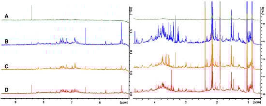 NMR spectra of rat fecal samples that were processed using four different techniques: (A) fatty acid favoring extraction; (B) no extraction; (C) ultrafiltration; and (D) Bligh–Dyer extraction. The spectra have been split at the water peak and the vertical scale has been increased to better illustrate the metabolites that are present.