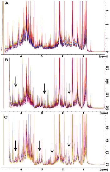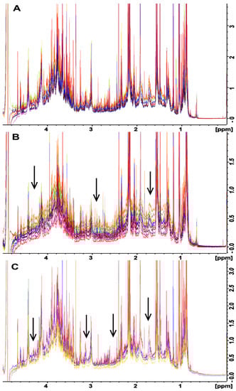 Comparison of NMR water-soluble metabolite spectra in the 1-5 ppm of range of rat feces that were divided into three equivalent aliquots and were processed by (A) ultrafiltration, (B) Bligh–Dyer extraction, and (C) no extraction. Spectra in (B,C) were processed after data collection using in silico baseline correction with a filter width of 175 Hz. The baseline correction has removed or greatly reduced the distortions observed for the same samples prior to correction. All three sample processing methods now produce a consistent baseline across all samples. Arrows correspond to those in Figure 2 showing areas where spectral fanning has been reduced or eliminated by in silico baseline correction.