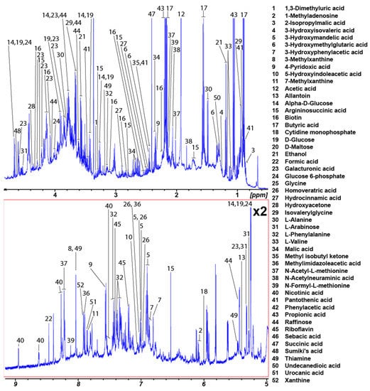From each sample, 275 μL was mixed with 120 μL of deuterium oxide (D2O), containing 0.027% w/v sodium 3-trimethylsilylpropanoate-2,2,3,3-d4 (TSP), and 205 μL of metabolomics buffer (total volume of 600 μL, pH 7.4); TSP was used as a chemical shift reference for 1H-NMR spectroscopy. The solution was vortexed and then centrifuged at 12,000× g for 5 min at 4 °C to pellet particulate matter. Following centrifugation, a 550 μL aliquot of the supernatant was loaded into a 5 mm NMR tube.