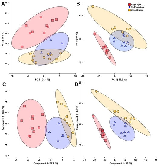 Principal component analysis (PCA) and partial least squares discriminant analysis (PLS-DA) score plots of all water-soluble fecal metabolite bins for rats (A,C); (n = 10) and chickens (B,D); (n = 8). The PCAs show unsupervised separation (A,B) and the PLS-DAs show supervised separation (C,D) among the three methods evaluated. For rats, p < 0.05, and for chickens, p < 0.001. Each symbol represents one fecal sample. For the PCAs, the data points are plotted with respect to the variability in the metabolome as given by the principal components. The x- and y-axes show principal components one and two, respectively, with brackets indicating percentage variance explained by each component. For the PLS-DAs, the data points are plotted using all bins, and the X and Y axes show the principal components with brackets indicating the percentage variance. The shaded ellipses represent the 95% confidence intervals for the score plots.