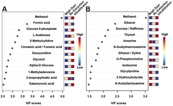 Variable importance to the projection (VIP) plots using all variables for rats (A) and chickens (B). The VIP plots show the top 12 fecal metabolites that contributed most to the separation seen in Figure 6C,D. The colored boxes along the right indicate whether the metabolite was up- or down regulated compared to the other extraction methods.
