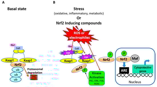 - Bloom, D.A.; Jaiswal, A.K. Phosphorylation of Nrf2 at Ser40 by protein kinase C in response to antioxidants leads to the release of Nrf2 from INrf2, but is not required for Nrf2 stabilization/accumulation in the nucleus and transcriptional activation of antioxidant response element-mediated NAD(P)H:quinone oxidoreductase-1 gene expression. J. Biol. Chem. 2003, 278, 44675–44682. [Google Scholar] [CrossRef] [Green Version]
