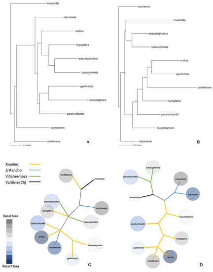 Neighbor joining trees (A,B) and unrooted strict consensus trees from maximum parsimony analysis (C,D) with morphological traits (A,C) and chemical compounds (B,D) in some Colombian species of Sticta. Colored lines represent localities from collected specimens. Colored circles represent their position in the molecular phylogeny of Moncada et al. (2014); grayish colors in the color scale refer to more basal taxa, whereas bluish colors are more recent taxa. Although S. lineariloba occurs in Colombia, the specimen in this study was collected in Valdivia (Chile). Independent of the grouping method, trees built based on chemical compounds recovered the geographic relationships, while trees built with morphological traits resemble the molecular phylogeny of Colombian Sticta.