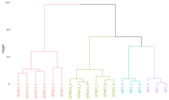 Dendrogram showing composition similarities between the three replicates of sugared black tea (SBT), sugared green tea (SGT) and corresponding kombucha samples (BTK and GTK) at day 7 (D7) and day 12 (D12), structured after Hierarchical Clustering Analysis.
