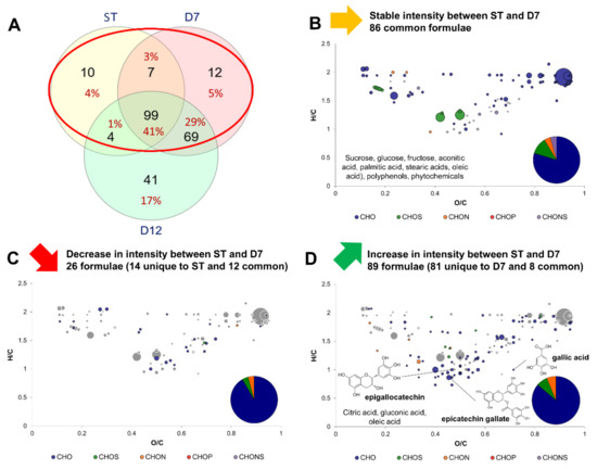 Change in composition between day 7 (D7) and day 12 (D12) kombuchas (common formula between black and green tea kombuchas). (A) Venn diagram of formulae identified at each process step: Sugared tea (ST), day 7 (D7) and day 12 (D12) with focus on the comparison of D7 with D12 (red circle). Van Krevelen diagrams and putative identities of (B) stable, (C) decreasing and (D) increasing formula between D7 and D12. The surface of bubbles expresses relative formulae intensity. Core metabolites formulae (Figure 2B) are represented in the background in grey.