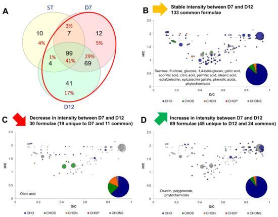 Figure 3 shows the modifications induced by P1 by comparing the variations in intensity of formulae between ST and D7. A Venn diagram indicates formulae common or exclusive to ST, D7 and/or D12 (Figure 3A). The core metabolites group of 99 formulae is represented at the intersection of the three ensemble circles. It is clearly visible that the main changes in molecular diversity occurred during P1 with the detection of 81 new formulae in D7 compared to ST. In contrast, only 41 new formulae were detected in D12 exclusively, while 69 were common with D7.