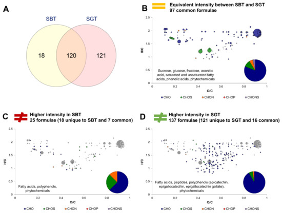 Comparison of composition between Sugared Black Tea (SBT) and Sugared Green Tea (SGT). (A) Venn diagram of formulae identified in SBT and SGT. Van Krevelen diagrams and putative identities of formula (B) equivalent in intensity in both conditions, (C) higher in SBT and (D) higher in SGT. The surface of bubbles expresses relative formulae intensity. Core metabolites formulae (Figure 2B) are represented in the background in grey.
