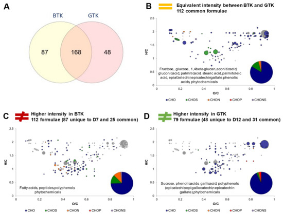 Comparison of composition between black tea kombucha (BTK) and green tea kombucha (GTK) (common formulae between day 7 and day 12). (A) Venn diagram of formulae identified in BTK and GTK. Van Krevelen diagrams and putative identities of formula (B) equivalent in intensity in both conditions, (C) higher in BTK and (D) higher in GTK. The surface of bubbles expresses relative formulae intensity. Core metabolites formulae (Figure 2B) are represented in the background in grey.