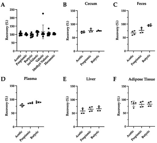 (A) Recovery percentages of a standard mixture using acidification with succinic acid. Recovery percentages of deuterated acetic acid, propionic acid and butyric acid in cecum (B), feces (C), plasma (D), liver (E) and adipose tissue (F).