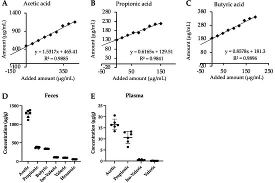 Standard addition method applied to acetic acid (A), propionic acid (B) and butyric acid (C) in cecum samples. The same feces (D) and plasma (E) sample were measured 6 times on different days to assess reproducibility.