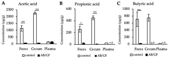The link between diet, gut microbes and their metabolites, such as SCFA, is of particular interest for the understanding and prevention of several diseases including obesity and associated inflammatory disorders such as fatty liver disease [,]. Mice lacking gut microbes either due to breeding in germ free (GF) facilities or due to their eradication by antibiotics (AB) display substantially affected SCFA levels. In particular, both germ free mice and AB-treated mice have strongly reduced SCFA levels [,]. As a proof of principle, we applied the GC-MS based method presented here for the quantification of SCFA on various murine tissue samples from normal control mice, mice treated with AB or GF mice. Figure 4 shows acetic acid (Figure 4A), propionic acid (Figure 4B) and butyric acid (Figure 4C) levels in the feces, cecum and plasma samples of control and either AB (feces samples) or GF (cecum and plasma samples) mice. As expected, levels of all major SCFA were significantly reduced in AB/GF mice compared to control mice. In line with a previous report [], butyric acid was particularly dramatically affected by microbiota depletion. In particular, in cecum and plasma, butyric acid levels were below the limit of quantification (Figure 4C). In summary, we demonstrate that the method presented here is applicable to real biological samples and may help to address relevant biological questions in the future.
