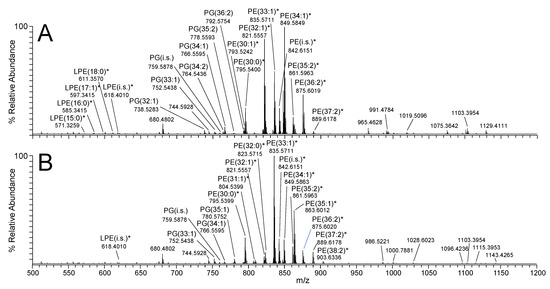 Figure 1A,B shows representative mass spectra acquired from the positive ionisation mode (+ve) ‘shotgun’ nano-electrospray (nESI)-MS spectra of crude derivatised lipid extracts from E. coli grown under EGP and SGP conditions, respectively. Derivatisation using S,S’-dimethylthiobutanoylhydroxysuccinimide ester (DMBNHS) and iodine/methanol (MeOH) enabled the resolution of potential isomeric mass overlaps between PE and PG lipids from any phosphatidylcholine and phosphatidylserine lipids that could potentially be present, respectively, while also increasing the ionisation and detection sensitivity of aminophospholipids, as well as enabling the resolution of potential plasmalogens fromplasmanyl lipids [42,43,44,45]. This approach, therefore, provides a simple strategy for the unambiguous assignment of these lipid species at the sum-composition level (19 PE and 14 PG lipids) based only on their accurate mass values determined using ultrahigh resolution accurate mass spectrometry (UHRAMS), without the need for chromatographic separation prior to MS analysis. Negative ionisation mode was used for the analysis of cardiolipins, via observation of their doubly deprotonated [M−2H]2− precursor ions. Figure 2 shows an example of the spectra acquired from E. coli grown under SGP conditions. The lower inset in this figure shows a region of the mass spectrum from 600 to 800 m/z from which several ions could be tentatively assigned as cardiolipins based on the characteristic 0.5 m/z spacing between their isotopes. However, due to the low relative abundance of these ions (approx. 2% of the base peak in the spectrum) and the congestion caused by the presence of many isobaric mass PE and PG lipids at similar m/z values, definitive annotation of these lipids was quite limited. In contrast, the upper inset in Figure 2 shows a region of the mass spectrum from 600 to 800 m/z acquired using nESI-high-field asymmetric-waveform ion-mobility spectrometry (FAIMS)-MS on the same sample, where all singly charged ions were filtered out, allowing the CL species to be clearly observed [46,47]. In addition, the signal intensity for these CL lipids was significantly increased by approximately fivefold due to their selective transmission and accumulation. Supplementary Figure S2 contains a comparable nESI-FAIMS-MS spectrum from the EGP sample. As a result of incorporating FAIMS into the analysis workflow, 34 CL species could be unambiguously identified at the sum-composition level within the EGP and SGP samples, whereas only 22 could be tentatively assigned in its absence.