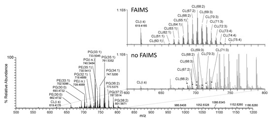 For the identification and characterisation of CL species, sample introduction and analysis were performed in the negative ionisation mode, similar to that described above but with filtering/enrichment achieved using FAIMS (FAIMS Pro, Thermo Fisher, Waltham, MA, USA) operating at a standard resolution with a static gas flow and a compensation voltage of 61 V (optimised for the transmission of cardiolipin [M−2H]2− precursor ion charge states) [45,46]. Spectra were acquired for 2.0 min with a m/z range of 400–1200.