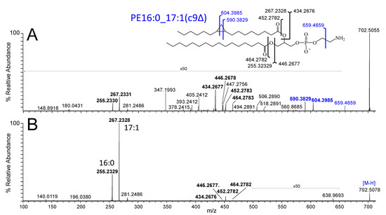 Negative ionisation mode spectra obtained by (A) 213 nm UVPD-MS/MS and (B) CID-MS/MS for structural characterisation of the [M−H]− precursor ion of E. coli PE(33:1) observed at 733.5045 m/z in Figure 2 as predominantly containing PE16:0_17:1(c9Δ) under SGP conditions. The structure shown in the inset indicates the assigned bond cleavage sites for the major product ions. Product ions labelled in blue text are unique to UVPD.