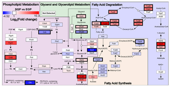 Under EGP conditions, cell replication requires a continual uptake of carbon nutrients to produce energy, and membrane lipids [59]. Therefore, cells transition to SGP conditions when the primary carbon sources such as fermentable sugars are depleted [27]. As a result, cell division ceases and the metabolism is altered to adapt to nutrient depletion stress. To maintain cellular energy homeostasis, lipids can be used as an alternate carbon source; therefore, lipid degradation and β-oxidation provide bacteria with energy in the SGP for survival [60]. Consistent with this, the SGP proteome exhibited an significant overall increase in abundance for the majority of proteins involved in fatty acid degradation compared with the EGP, while all proteins involved in the fatty acid synthesis pathway trended toward a decrease in abundance under SGP conditions, with two proteins, namely FabH and FabA, reaching significance (Figure 3). Similar what was discussed above for Cfa, the upregulation of FabH is a determining factor in branched-chain fatty acid biosynthesis under EGP conditions and is likely to be responsible for the observed highly significant increase in abundance, despite the low absolute abundance, of odd-numbered saturated branched-chain fatty acyl chains containing PE(29:0), PE(31:0) and PG(31:0) lipids under SGP conditions (Figure 3) [61,62].