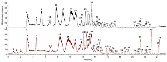 UHPLC chromatogram of Phycella cyrtanthoides bulbs (black) and leaves (red) in positive mode.