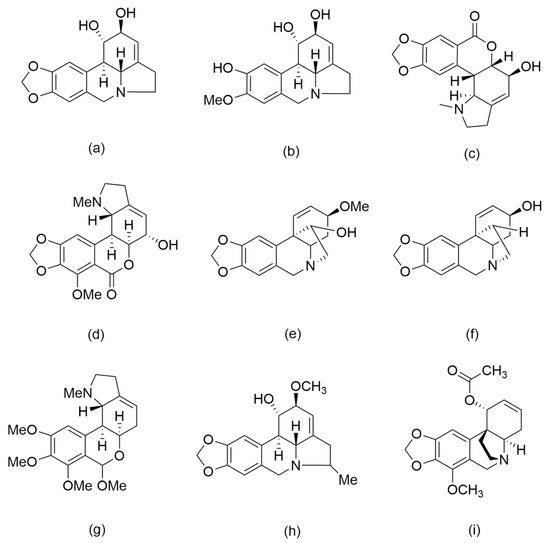 Lycorine (a), pseudolycorine (b), hippeastrine (c), candimine (d), haemanthamine (e), vittatine (f), 7-methoxy-O-methyllycorenine (g), 5-methyl-2-epihippamine (h) and 1-O-acetylbuphanamine (i).