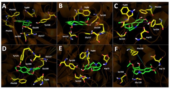 Predicted binding mode and predicted intermolecular interactions of major alkaloids in leaves and bulbs of Phycella cyrtanthoides extracts and the residues of Torpedo californica acetylcholinesterase (TcAChE) catalytic site; (A) 3-hydroxydihydrocaranine in the catalytic site; (B) Kirkine in the catalytic site; (C) 10-O-dimethylgalanthine in the catalytic site; (D) 2-α-methoxy-6-O-ethyloduline in the catalytic site; (E) 10-norpluviine in the catalytic site; (F) 3-O-acetylnarcissidine in the catalytic site. Yellow dotted lines indicate hydrogen bond interactions; cyan dotted lines represent π–π interactions; magenta dotted lines represent T-shaped interactions; and red dotted lines indicate salt bridge interactions.