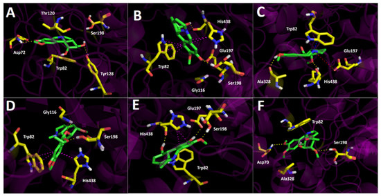 The 2-α-methoxy-6-O-ethyloduline established pose into the butyrylcholinesterase catalytic site is quite different relative to the other major alkaloids studied; however, this derivative is still stabilized through two hydrogen bond interactions with Gly116 and Ser198, as well as two T-shaped interactions performed by the 1,3-benzodioxole moiety and the amino acids Trp82 and His438 (Figure 5D).