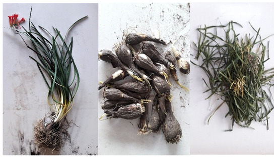 Phycella cyrtanthoides: entire plant (left), bulbs (middle), and leaves (right).