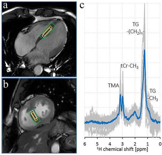 1H MR spectrum from the myocardium of a volunteer. The left panel displays the voxel positioning. (a) A quasi-4-chamber view (b) and an end-systolic short-axis view. (c) The right panel depicts the MR spectra (mean spectrum in blue). TMA, trimethylamine-containing compounds; tCr-CH3: total creatine-methyl; TG–CH2–)n triglyceride-methylene. Adapted from ref. [15] an open-access article under the terms of the Creative Commons CC BY license.