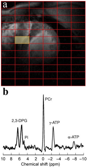 Cardiac MRS enables an in vivo detection and quantification of myocardial metabolism, examining healthy and pathological conditions. It is possible to acquire MRS data derived from different endogenous nuclei (Table 1). Phosphorus is the most widely investigated for myocardial bioenergetics studies. Additionally, proton MRS can visualize crucial molecular triglycerides and creatine (Cr). MR spectra can be acquired from single volume elements (single-voxel spectroscopy (SVS)) with localization determined from MR images or from multiple volume elements (multi-voxel), which is referred to as multi-voxel magnetic resonance spectroscopic imaging (MRSI) or chemical shift imaging (CSI) [13,14]. In MRS, individual metabolites are detected based on their resonant frequencies that can be encoded and identified. This technique allows the acquisition of MR spectra simultaneously from a two-dimensional (2D) or three-dimensional (3D) array of voxels. 2D MRSI extends the SVS to a selective slice, in which the in-plane voxels are phase-encoded. 3D MRSI is further extended to a volume to increase the metabolic mapping coverage. Anatomical MR images, usually navigator-gated balanced steady-state free precession cine images, are used as a guide to planning the MRSI grid (voxels) (Figures 3 and 4). This section provides examples from recently published articles and a brief overview of the possible interaction between MR Spectroscopy and clinical practice.