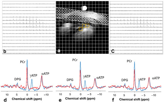 Saturation transfer techniques allow CK examinations in vivo. (a) An anatomical image highlights the typical voxel (orange) location chosen for analysis. 31P CSI from the slice (b) control and (c) saturation conditions. (d–f) Typical 31P magnetization transfer spectra from selected voxels. Control spectra are shown in blue and saturated spectra (γATP saturation) are in red. The PCr signal is reduced when γATP is saturated. Illustration from [35] an open-access article under the terms of the Creative Commons CC BY license.