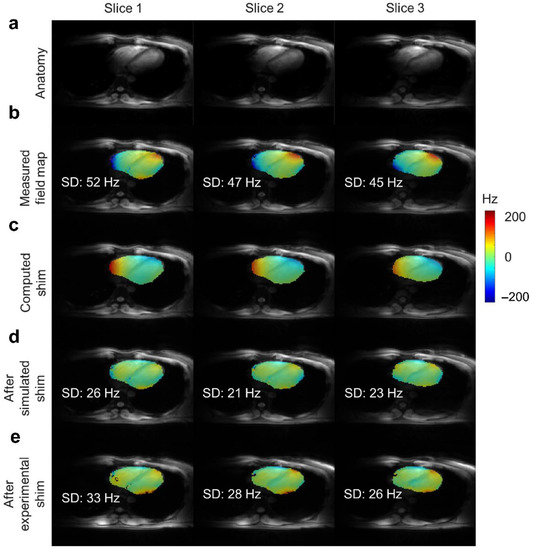 In vivo B0 shimming of the heart using 3rd-order sets at 7 Tesla. (a) Region of interest on the magnitude images, (b) Initial measured B0-field distribution (SD, standard deviation, across the sliced region of the heart); (c) Computed magnetic shim field; (d) Expected B0-field distribution after the simulated shim; (e) B0-field distribution measured after the experimental shim. Illustration is from ref. [45] an open-access article under the terms of the Creative Commons CC BY license.