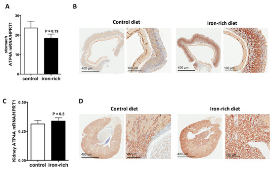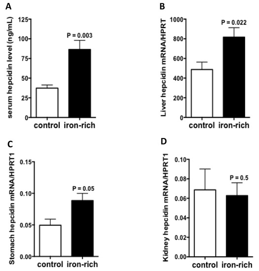 Since ATP4A was reduced in hepcidin knockout mice both in stomach and kidney [24,29], we investigate its regulation by iron-rich diet, a condition where hepatic hepcidin is induced. The results of quantitative RT-PCR experiments showed that the transcript levels of ATP4A remained unchanged but the immunostaining experiments showed that the expression of ATP4A protein was strongly stimulated under conditions of iron-rich diet relative to control diet (Figure 5A,B). Similar data were also observed in the kidney (Figure 5C,D). Serum hepcidin was as expected, significantly augmented by the iron-rich diet (p = 0.003) (Figure 6A). The transcript levels of hepatic and gastric hepcidin transcripts were both increased under iron-rich conditions compared with control conditions (p = 0.022 and p = 0.05, respectively) (Figure 6B,C). In contrast, the iron-rich diet did not affect the mRNA expression of renal hepcidin compared with control mice (Figure 6D).