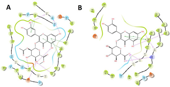 Quercetin 3-O-ß-D-2″-acetylglucuronide and quercetin 3-O-ß-D-2″-acetylglucuronide methyl ester are almost spatially located in the same manner. In fact, both compounds perform hydrogen bond interactions through the oxygen atom of the hydroxyl groups at position 7- of the 4H-chromen-4-one and Tyr128 residue. Likewise, another hydrogen bond interaction through the hydrogen atom of the same already mentioned hydroxyl function of both derivatives are performed with Glu197. Besides, the 4H-chromen-4-one core of both compounds carry out a π-π interaction with Trp82. According to their differences, it can be seen a few of them between these two derivatives, for example a π-cation interaction performed by the phenolic ring of quercetin 3-O-ß-D-2″-acetylglucuronide and the amino acid His438, as well as three hydrogen bond interactions with Gly115 and Ala328 carried out by the appropriate hydroxyl functional groups of quercetin 3-O-ß-D-2″-acetylglucuronide (Figure 6D,E).