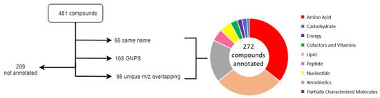 To investigate the vertical transfer, we have matched metabolomics data from DBS and plasma with two different chromatographic systems. The mothers’ dataset consists of 1130 biochemicals, of which 913 were annotated, whereas only of the infants’ metabolome (~150 compounds) was annotated, according to the Metabolomics Standard Initiative’s reporting standards, at level 2 [12]. The identified metabolites were classified as lipids, amino acids, nucleotides, peptides, xenobiotics, cofactors, and vitamins based on the chemical taxonomy provided by Metabolon. Sixty six compounds appeared by the same annotated chemical name between the mothers plasma and newborns DBS datasets. By matching masses in m/z window of resulted in 481 compounds found, including the 66 compounds identified previously. Of the remaining, 98 compounds were found to have a unique match between metabolites detected in mothers and those in DBS, while further 108 were annotated through manual annotation propagation through the Global Natural Products Social Molecular Networking Platform (GNPS) [13], resulting in a total of 272 annotated compounds (Table S3). These matching compounds are dominated by amino acids (), lipids (), and xenobiotics (). (See Figure 2 for details).