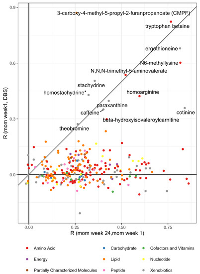 Tryptophan betaine is a N-methylated form of tryptophan. This metabolite has a higher correlation between individuals, compared to within the same individual over time: . Since the child has only half the mother’s genetic, a value of indicates a strong influence of environment including diet, and tryptophan betaine is also known to be abundant in legumes [17], nuts [18], and in the breastmilk of the mothers after peanut consumption [19].