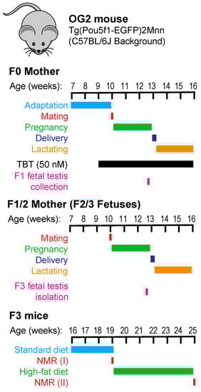 Transgenerational diet-induced obesity initiated by in utero exposure of mice to TBT. We previously reported that in utero exposure of C57BL/6J mice to an environmentally relevant dose of TBT initiated transgenerationally inherited predisposition to diet-induced central obesity [5,6,7,9]. To obtain mechanistic insights into this phenomenon, in the current study, we repeated the animal exposure experiment using the OG2 transgenic mice, which express EGFP specifically in primordial germ cells and prenatal germline precursor cells driven by the Pou5f1/Oct4 promoter and distal enhancer [10].
