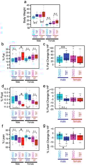 Diet-induced obesity of TBT-exposed F3 mice. F3 offspring of F0 mothers gestationally exposed to TBT or DMSO were fed with a standard (STD) diet until 19-weeks-old and then challenged with a high-fat (HF) diet for 6 weeks. Total body weight or body compositions were measured before and after the HF diet. Each box plot represents the median, 25/75 percentile, and min/max of data (n = 11~30). Statistical significance (t-test with Welch’s correction for heteroscedastic data pairs) is indicated by *, p < 0.05; **, p < 0.01, n.s., not significant. (a) Total body weight. (b–g) NMR assessments of fat (b,c), fluid (d,e), and lean (f,g). Panels (c,e,f) show relative changes by HF challenges in fat, fluid, and lean, respectively.