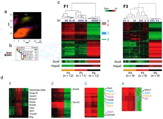 Transcriptomes of F1 and F3 fetal testicular cells. (a,b) FACS enrichment of EGFP+ germline cells (P4 and P5) and EGFP- somatic cells (P6) from E18.5 fetuses. (a) Germline and somatic cell populations isolated by FACS with GFP and side scatter (SSC) intensities. (b) Relative sizes of cell populations. (c,d) Heatmap representations of unsupervised hierarchical clustering of transcriptomes determined by RNA-seq for F1 and F3 testicular cells. Transcriptomes of animals whose F0 mother was exposed to TBT are labelled by blue rectangles. The green-red colors indicate down- and up-regulation of genes. Parts of transcriptomes in panel (c) are enlarged in panel (d).