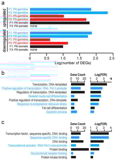 Differentially expressed genes (DEGs) in fetal testes. (a) Numbers of genes up- or down-regulated in E18.5 F3 fetal testicular cells of the TBT-exposed lineage compared to the DMSO-exposed control lineage. (b,c) Gene ontology analysis of DEGs up-regulated by TBT exposure in F1 P6-somatic cells; (b) biological pathways, and (c) molecular functions.