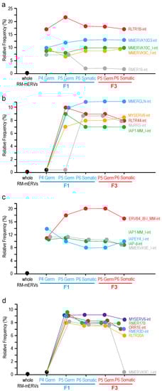 Differentially expressed mERVs. mERVs differentially expressed between E18.5 fetal testicular cells in F1 or F3 offspring of the TBT- and DMSO-exposed F0 mothers. Statistically significant, differentially expressed mERVs (FDR < 0.05) in the FACS-enriched germline or somatic cells were identified. Relative frequencies of mERV species enriched beyond the frequencies expected from random sampling from the whole RepeatMasker (RM) registered mERVs are plotted. (a,b) mERVs up-regulated in the TBT-group offspring; (c,d) mERVs down-regulated in the TBT-group offspring. Panels (a,c) show mERVs whose expression in P4 germline cells was affected by F0 exposure to TBT whereas mERVs shown in panels (b,d) are not affected.