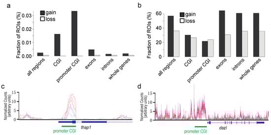 Effects of F0 exposure to TBT on DNA methylation in E18.5 F1 fetal testicular somatic cells determined by MBD-seq. (a,b) Changes in DNA methylation at representative genomic regions of interest (ROIs) in TBT-F1 somatic cells compared to DMSO-F1 somatic cells; (a) changes in differentially methylated regions, (b) changes in the whole genome; (c,d) representative DNA methylation profiles at a differentially methylated (c) or not, (d) promoter-associated CpG islands. Normalized methylation scores calculated for DMSO-F1 (blue) or TBT-F1 (red) testicular somatic cells isolated from three independent litters of fetuses are shown.