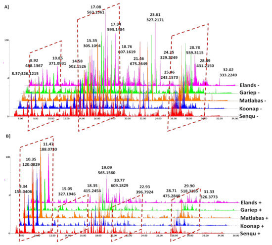 Crude methanolic extracts of leaf tissue from five dryland wheat varieties planted in winter–spring rainfall regions of South Africa (Table S1) were separated on ultra-high performance liquid chromatography coupled to a quadrupole time-of-flight high-definition mass spectrometry detector (UHPLC-qTOF-MS). Metabolite profiling was performed in both positive and negative electron spray ionisation (ESI) modes to allow inclusive, non-biased coverage and global analysis of the metabolome. The inspection of the extracted LC chromatograms displaying distinct base peak intensities (BPI) from negative Figure 1A and positive data Figure 1B showed good chromatographic separation considering the complexity of the multi-dimensional metabolome covering a broad range of polar and non-polar metabolites. Furthermore, the BPI MS chromatograms revealed differentially populated peaks (each with unique m/z values, intensities and retention times (Rts), representing the qualitative (presence/absence) and quantitative (intensity/concentration) detection of metabolites, thus providing a visual description of the similarities and differences between the selected wheat varieties.