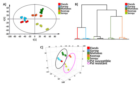 PCA separated the cultivars into five distinct groups (Figure 2A), showing differential clustering of the varieties based on their differences in metabolite profiles and distribution. It is important to note that differential clustering of the cultivars is not solely dependent on the qualitative composition of metabolites, but rather in combination with the differential quantitative distribution of each metabolite between the cultivars. The generated PCA score plot illustrates the similarities or differences within (intra-cultivar variance by PC2) and between (inter-cultivar variance by PC1) the sample clusters [30,31]. Figure 2A shows the grouping of Pst-susceptible cultivars together (‘Gariep’ and ‘Elands’), while the resistant cultivars of ‘Koonap’ and ‘Senqu’) were distributed further away from the susceptible cultivars. The ‘Matlabas’ cultivar is also susceptible to Pst; however, located towards the middle, separated from the ‘Gariep’ and ‘Elands’. The HiCA plot in Figure 2B complements this observation. The HiCA further reveals how the groups of cultivars chemically relate to or are separated from one another. The distinct separation of the five groups directly mimics the distribution of the groups as observed on the PCA, with ‘Senqu’ and ‘Koonap’ showing the most significant separation from ‘Elands’ and ‘Gariep’. The positioning of the ‘Matlabas’ cultivar closer to ‘Koonap’ suggests the composition of similar metabolic features associated with resistance as with the resistant cultivar, and this phenomenon is further visualised in the descriptive heatmap discussed below in Figure 3B.