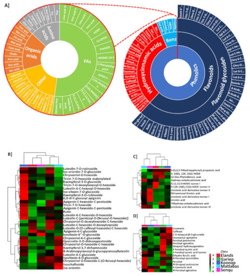 Distribution of annotated metabolites among five wheat cultivars. (A) The sunburst plot shows the classification of the annotated, putatively identified metabolites, and the main classifications of annotated metabolites were phenolics (with flavonoids and HCAs), fatty acids, organic acids and amino acids. (B–D) The distribution of selected annotated metabolites among five wheat cultivars according to class. Samples are projected in columns with the metabolites in rows. The data were log-transformed, and Pareto scaled in the Ref. [32]. Colour-coding indicates abundance (red = high abundance, green = low abundance). Some metabolites are found in high abundance in some cultivars, and very low abundance in other cultivars.
